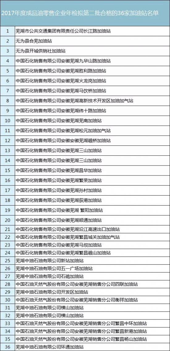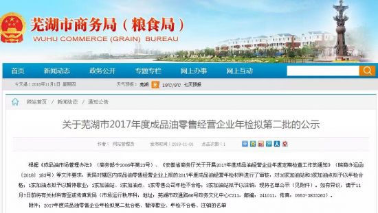 芜湖广电新闻频道报道,近日,芜湖市商务局(粮食局)公开了对辖区内成品油零售经营企业上报的2017年度好成品油经营年检材料进行了审核结果。