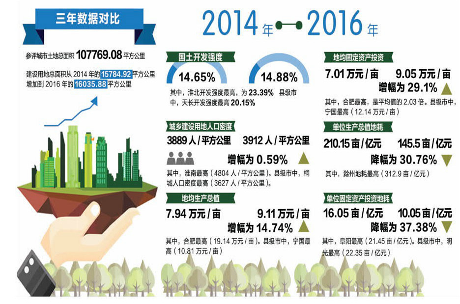安徽商报讯(记者 郜征/文 欧恺/图) 我省国土开发强度微增,但生产总值、固定投资等增幅明显,显示经济发展强劲。安徽商报融媒体记者15日从省国土厅获悉,我省截至2016年土地节约集约利用评价结果出炉,合肥生产总值、固定投资最高,淮北开发强度最大,淮南人口密度最高,滁州生产总值地耗最高。