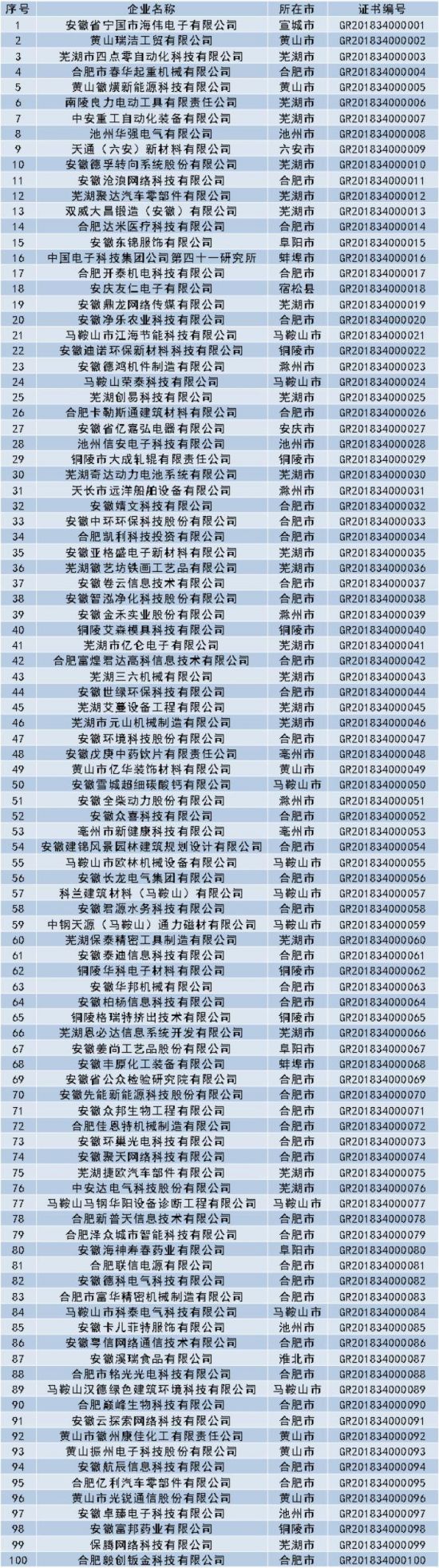 安徽省2018年第一批高新技术企业认定名单(部分)