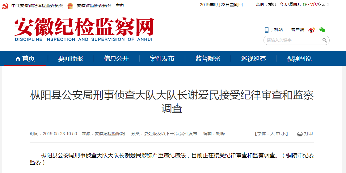 枞阳县公安局刑事侦查大队大队长谢爱民涉嫌严重违纪违法,目前正在接受纪律审查和监察调查。(铜陵市纪委监委)