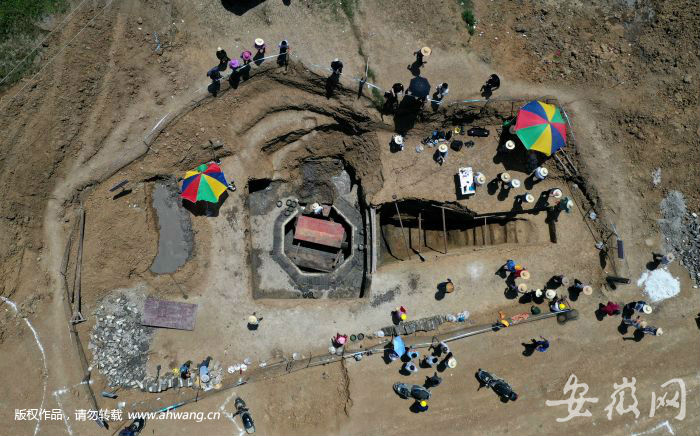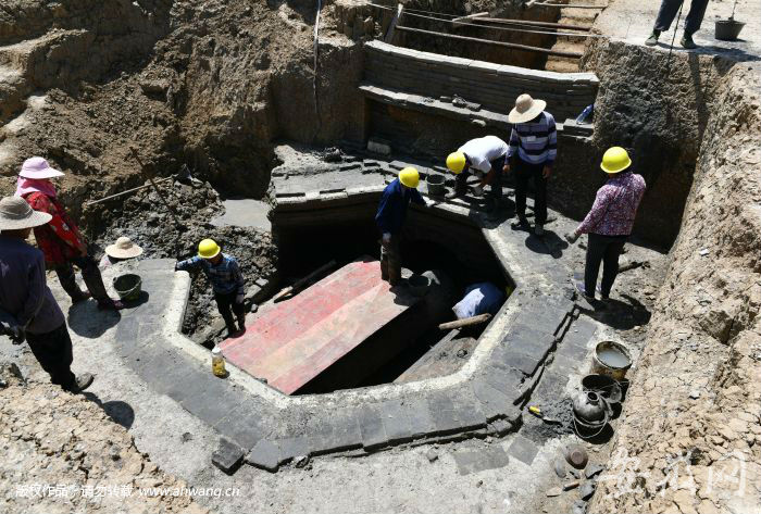 新安晚报 安徽网 大皖客户端讯 4月上旬,合肥长丰县下塘镇埠里社区沛双路(淮南北路北延)项目,挖掘机在施工过程中发现一座古代砖室墓。连日来,考古人员初步确定这处墓葬群有13座古墓,并对已经暴露的墓葬(编号M1)进行抢救性考古发掘。从发掘情况来看,该墓形状为合肥地区非常罕见的八边形砖室墓,里边发现大中小三个保存完好的棺椁,初步判断该墓年代不早于晚唐不晚于宋。