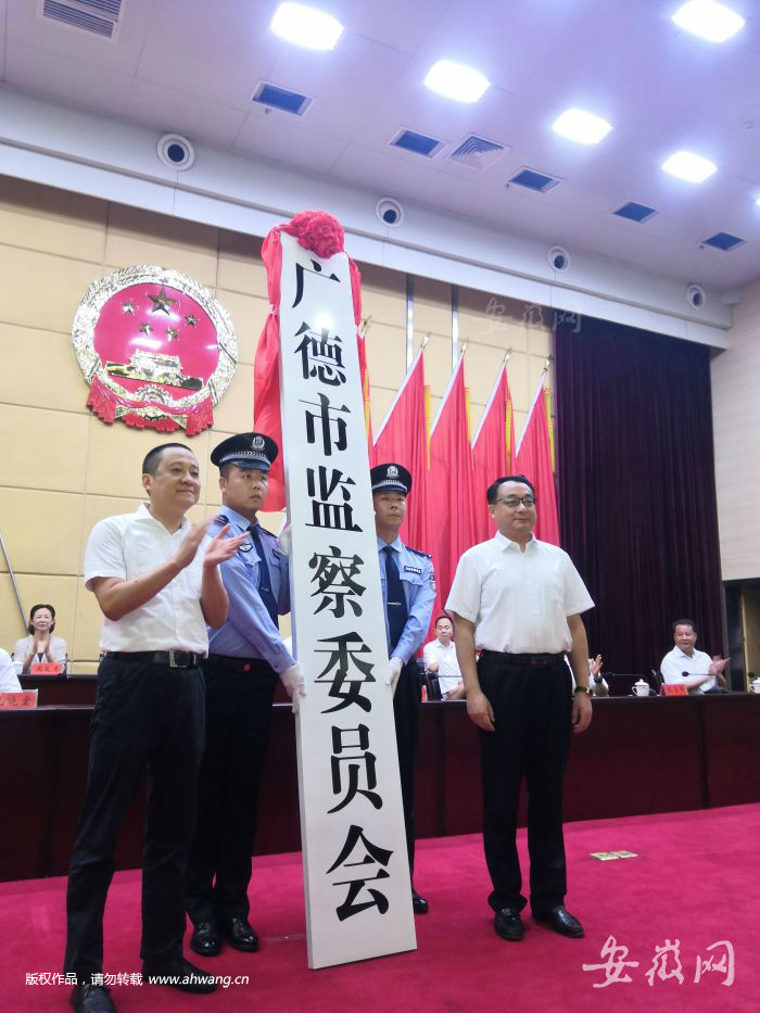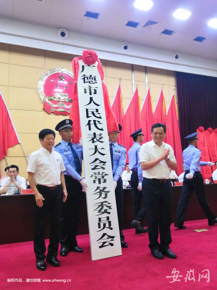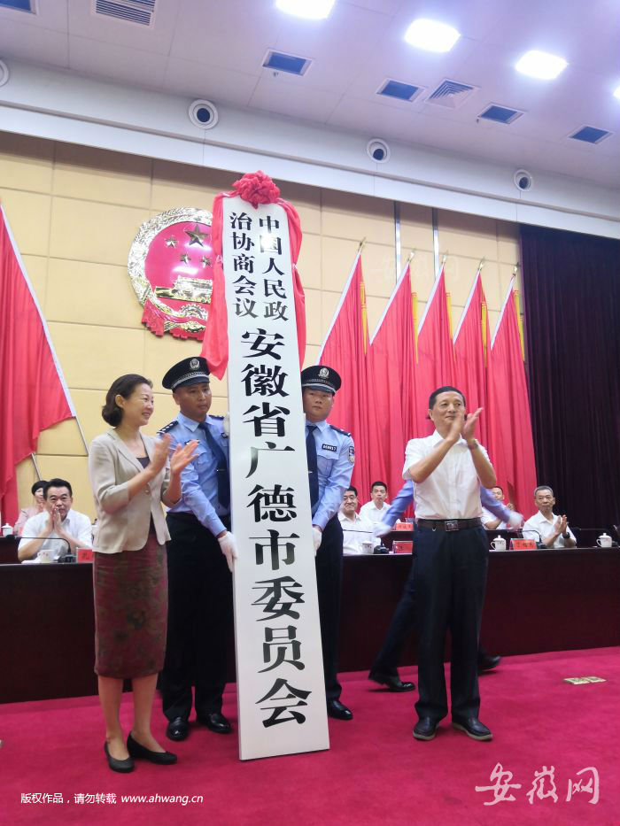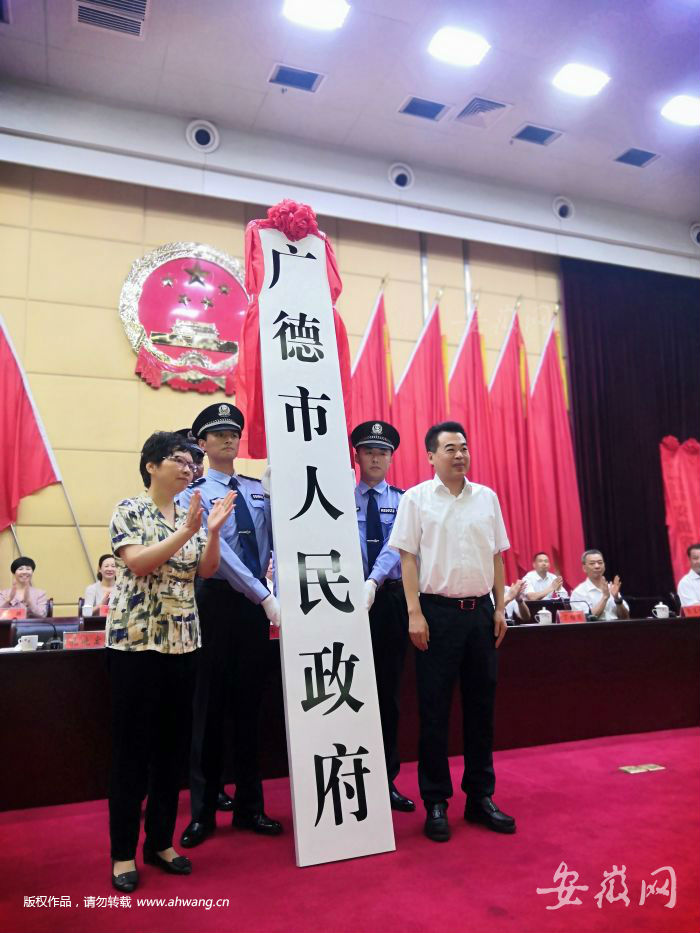 安徽网大皖客户端讯 今天上午九点,广德撤县设市大会召开。省民政厅副厅长汪韧在会上宣读《安徽省人民政府关于撤销广德县设立县级广德市的通知》。会上举行广德市委、市人大、市政府、市政协、市纪委(监委)揭牌仪式。