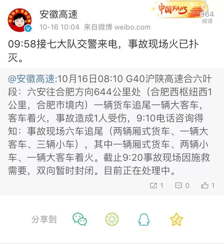 据@安徽高速 今日上午消息:10月16日08:10,G40沪陕高速合六叶段:六安往合肥方向644公里处(合肥西枢纽西1公里,合肥市境内)一辆货车追尾一辆大客车,客车着火,事故造成1人受伤。