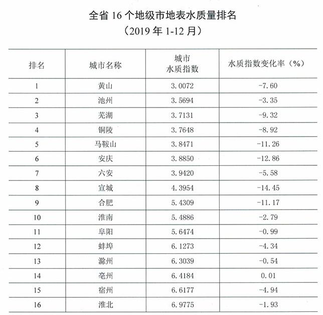 安徽公布2019年16市地表水环境质量排名 黄山池州芜湖名列前三