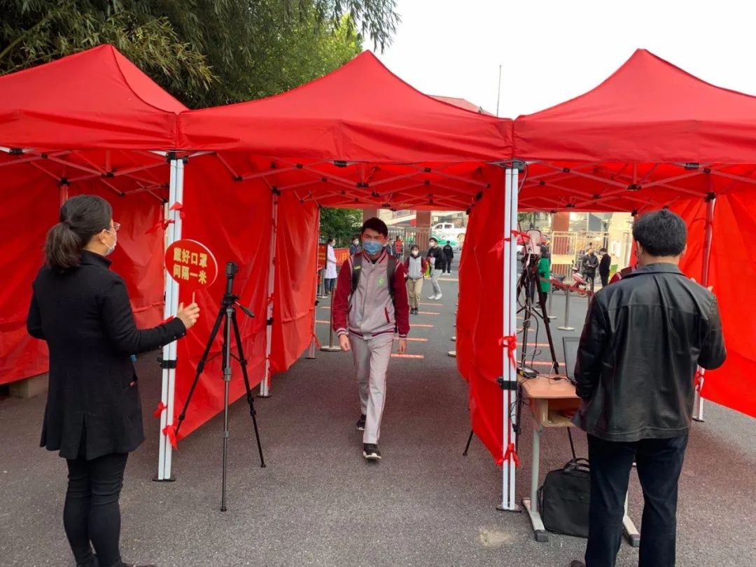 合肥一中高三年级一共有40个教学班,为确保2000多名高三学生安全返校,安排了各个班级错时、错峰进入校门,并且在校门口设置了六条学生返校通道以及测温门,以及值班老师手持额温枪进行辅助。