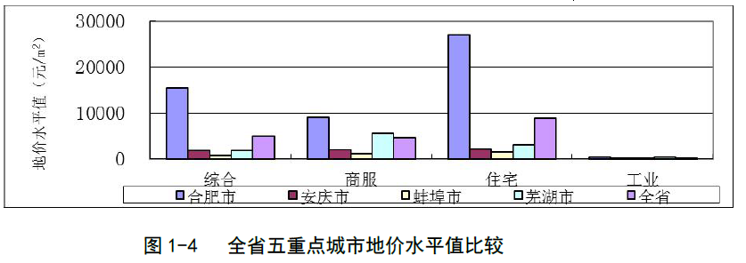 报告发布了重点城市情况:合肥各用途地价水平值明显高于芜湖、安庆和蚌埠四重点城市地价差异分化较大,合肥市地价水平首位特征明显,各用途地价水平远高于其他三市,以住宅地价差异最为明显,合肥地价(26944 元/m2)是末位蚌埠市(1422 元/m2)的18.95 倍;住宅地价芜湖(5557 元/m2)次之、其次是安庆(2075 元/m2),最后是蚌埠市。四个重点城市工业地价水平在259~400 元/m2 之间,相对较均衡(见图1-4)。