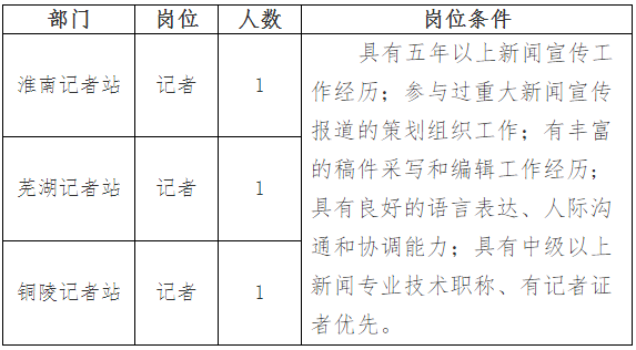 因事业发展需要,现面向淮南、芜湖、铜陵三市公开选聘安徽日报记者站工作人员。