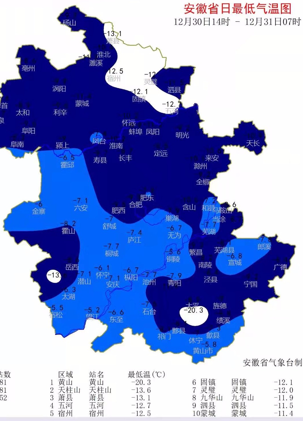 12月31日,安徽省最低气温图再次被代表低温的深紫色和深蓝色覆盖,最低气温比前一天有过之而无不及。气温最低值出现在萧县,为-13.1℃。值得一提的是,据合肥市气象台发布的数据,历史上,合肥市12月出现最低气温相比1月、2月较少。本次寒潮雨雪天气过程,12月30日出现的最低气温(-7.4℃)在12月下旬的历史排位中可排第八名。2020年12月31日纪录被刷新——合肥市最低气温-9.5℃,在12月下旬的历史排位中可排第四名,是1973年以来12月下旬最冷的一天。
