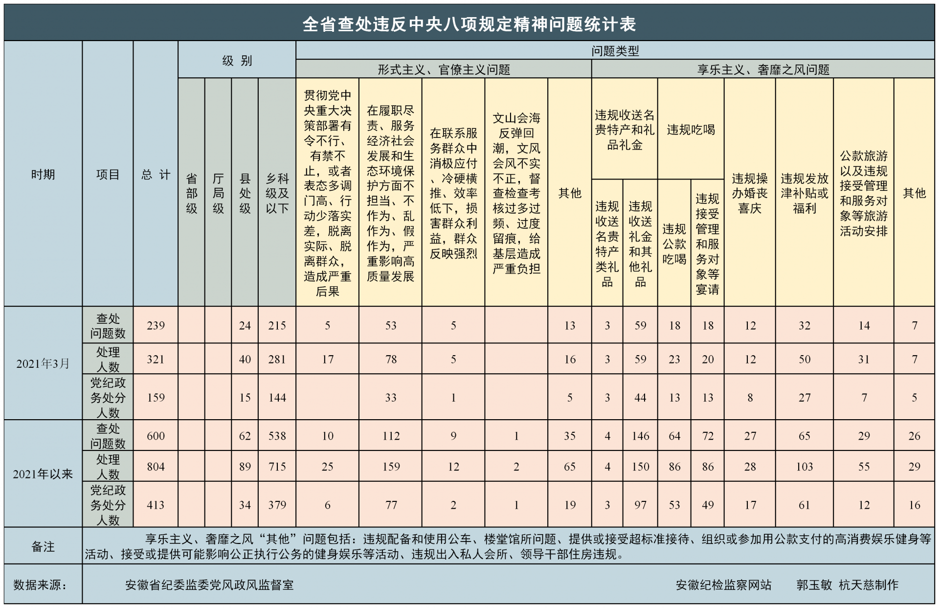 安徽省2021年3月查处违反中央八项规定精神问题239起
