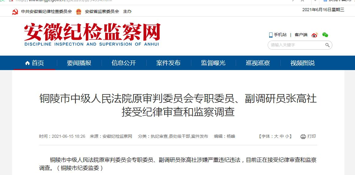 铜陵市中级人民法院原审判委员会专职委员、副调研员张高社涉嫌严重违纪违法,目前正在接受纪律审查和监察调查。(铜陵市纪委监委)