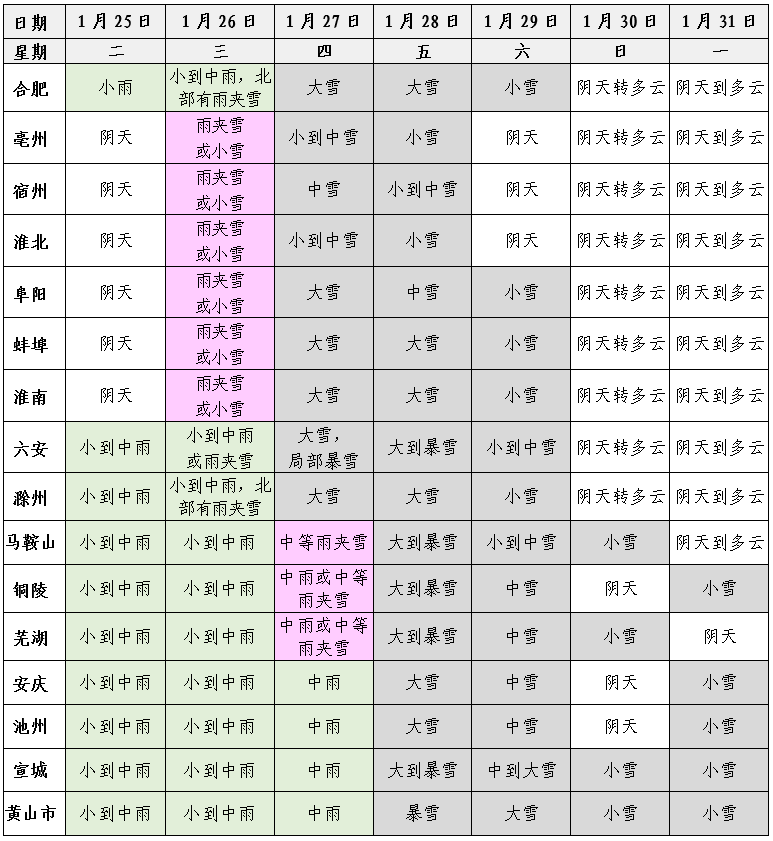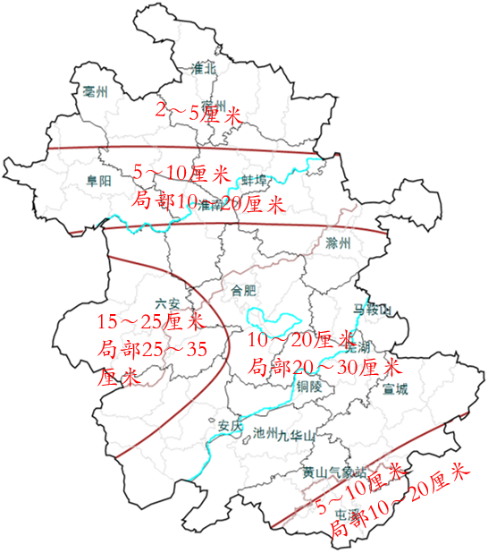 28日(周五):淮北地区有小到中雪;江淮之间和沿江江南中北部有中到大雪,部分地区暴雪,局部大暴雪;江南南部有中雨或雨夹雪。同时,大别山区和皖南山区局部有冻雨。