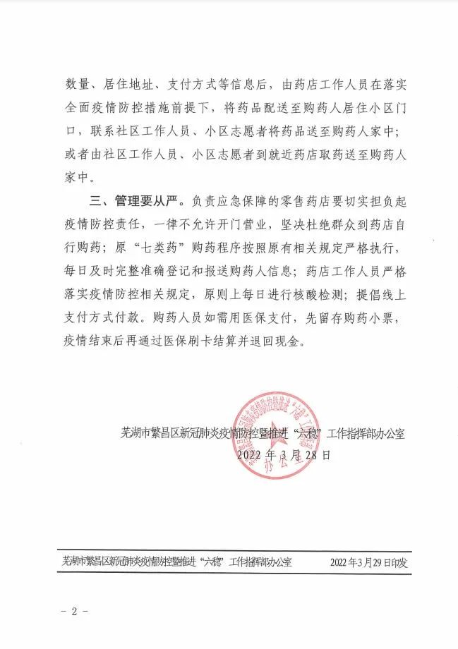 据繁昌区人民政府发布微信号消息,2022年月3月28日,芜湖市繁昌区新冠肺炎疫情防控暨推进“六稳工作指挥部办公室发布关于疫情期间群众购药应急保障的通告,要求群众购药不到店。