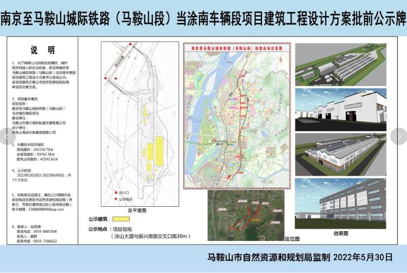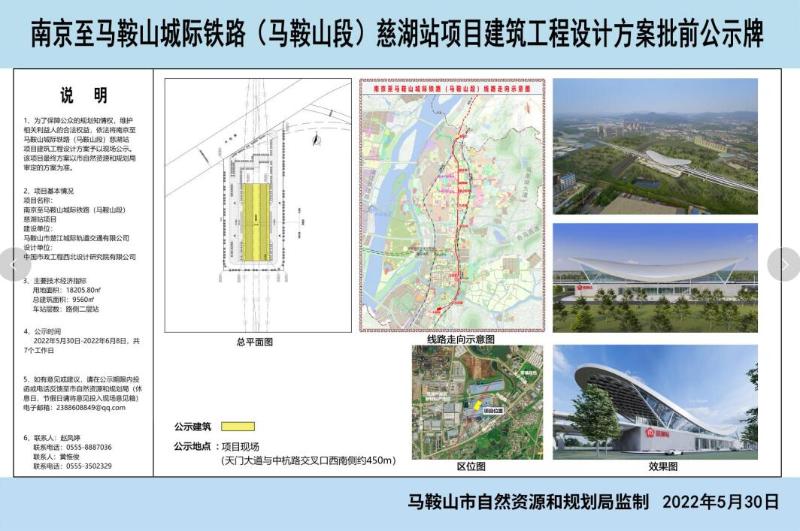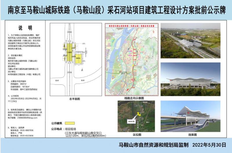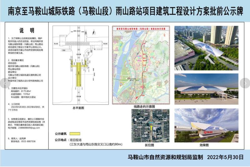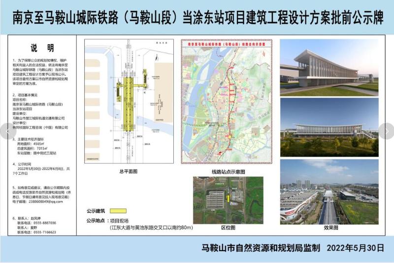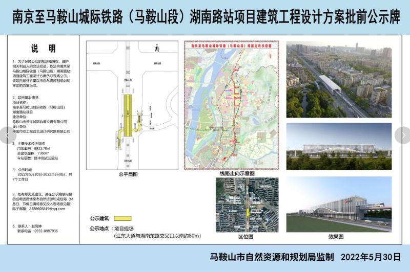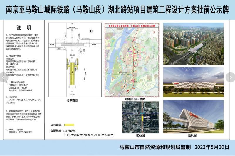 据马鞍山自然资源和规划局网消息,5月30日,马鞍山市自然资源和规划局官网发布宁马城际铁路(马鞍山段)各站点项目建筑工程设计方案批前公示。