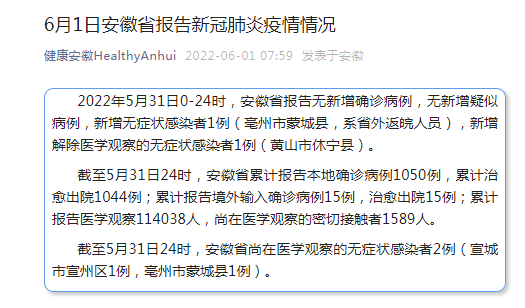 2022年5月31日0-24时,安徽省报告无新增确诊病例,无新增疑似病例,新增无症状感染者1例(亳州市蒙城县,系省外返皖人员),新增解除医学观察的无症状感染者1例(黄山市休宁县)。