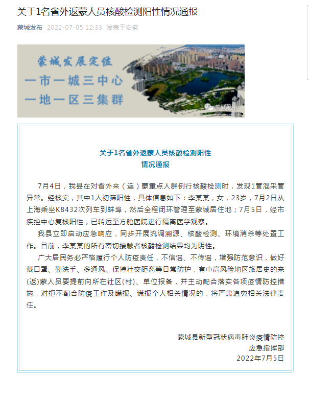 7月5日,蒙城县新型冠状病毒肺炎疫情防控应急指挥部发布情况通报,1名省外返蒙人员核酸检测阳性。