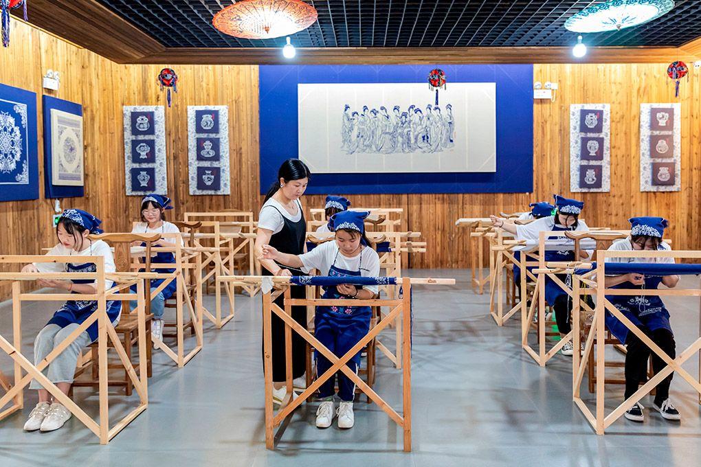望江县纪委监委利用挑花技艺展现廉洁文化,创作了《拿人钱手必短》《百姓心中有盏灯》《廉政三字经》等一系列挑花作品。图为该县皖江学院学生在学习挑花技艺。 江婵娟/摄
