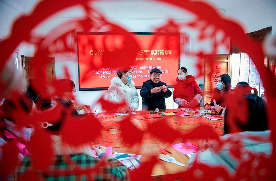 含山县纪委监委邀请剪纸非遗传承人带领年轻干部开展廉洁剪纸活动。欧宗涛/摄