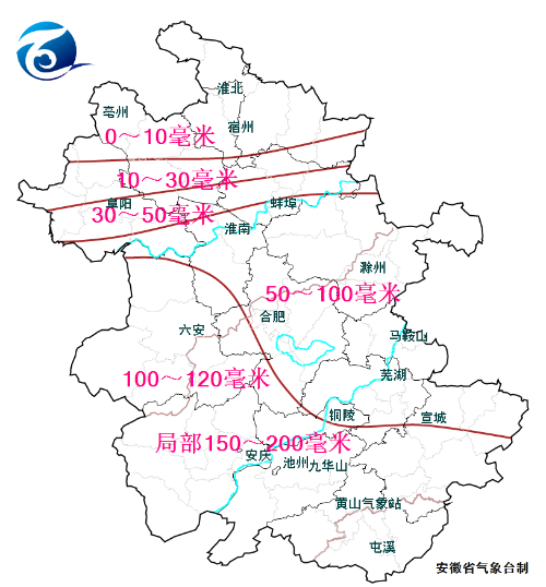 过程累计雨量:沿淮淮河以南50~100毫米,其中江淮之间中西部和江南大部100~120毫米,局部150~200毫米。