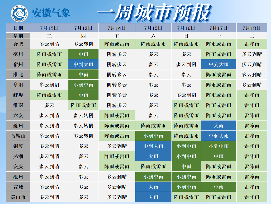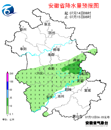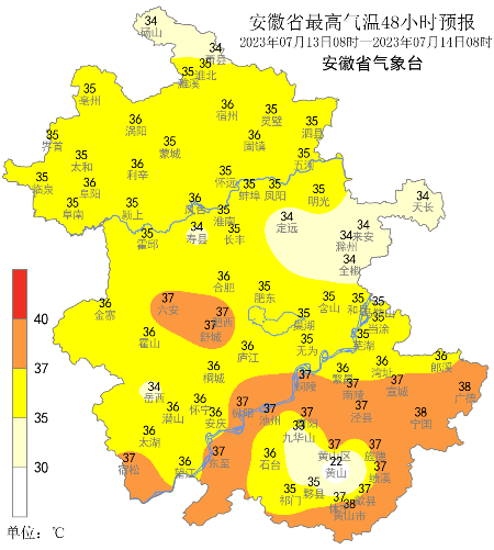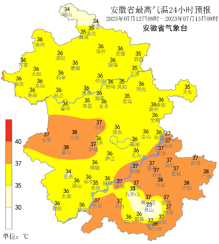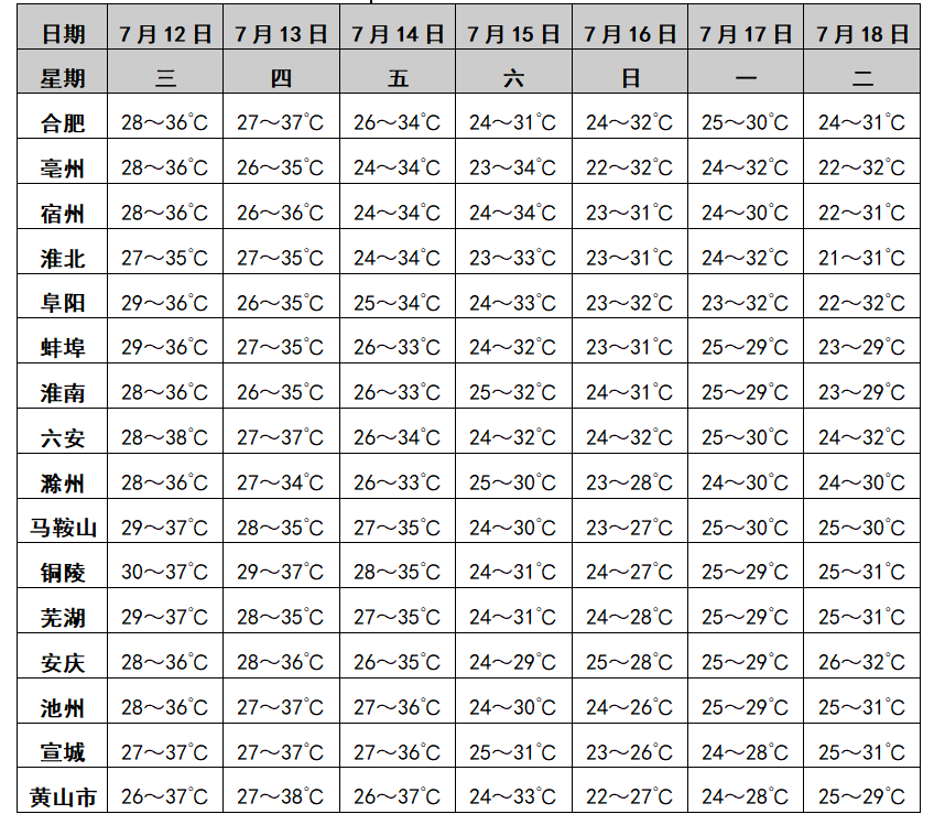 据安徽气象微信公众号消息,昨日(7月11日)我省出梅,梅雨量偏少、梅雨强度偏弱,梅雨期以过程性降水为主,局地降水强度大。昨日全省大部分地区出现高温天气,有30个市县超过37℃,宿州、蚌埠、滁州等地出现局地强对流。未来三天全省以高温天气为主,12日至13日我省大部分地区最高气温35℃左右,部分地区36~38℃;14日大别山区局部和江南的最高气温仍在35℃以上。15日后全省最高气温普遍在35℃以下。13日夜里至16日我省自北向南有一次明显降水过程。