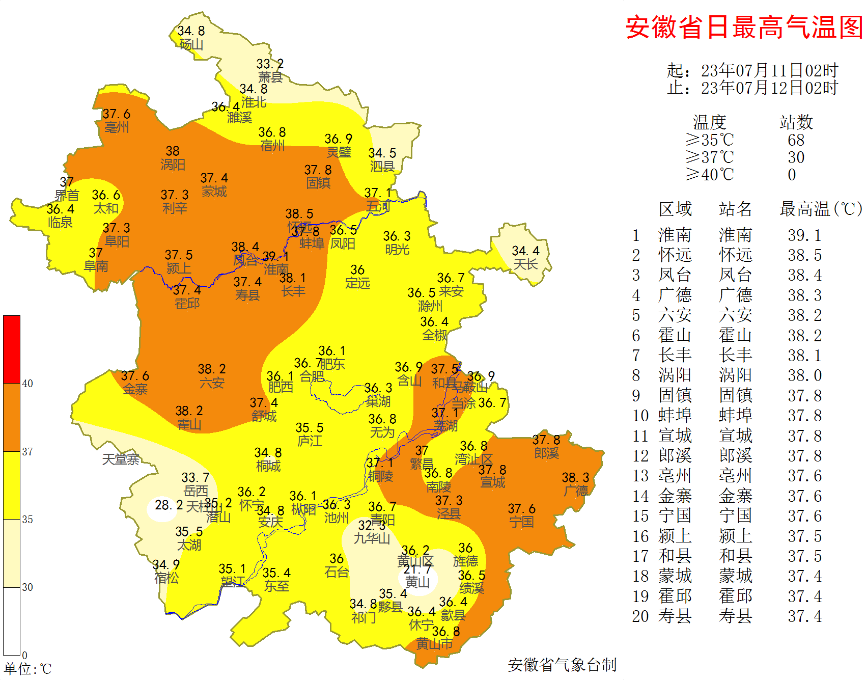 高温:昨天我省大部分地区出现高温天气,有68个市县最高气温超过35℃,其中亳州、阜阳、六安、芜湖、马鞍山、铜陵、宣城等地等地有30个市县超过37℃,最高淮南39.1℃。