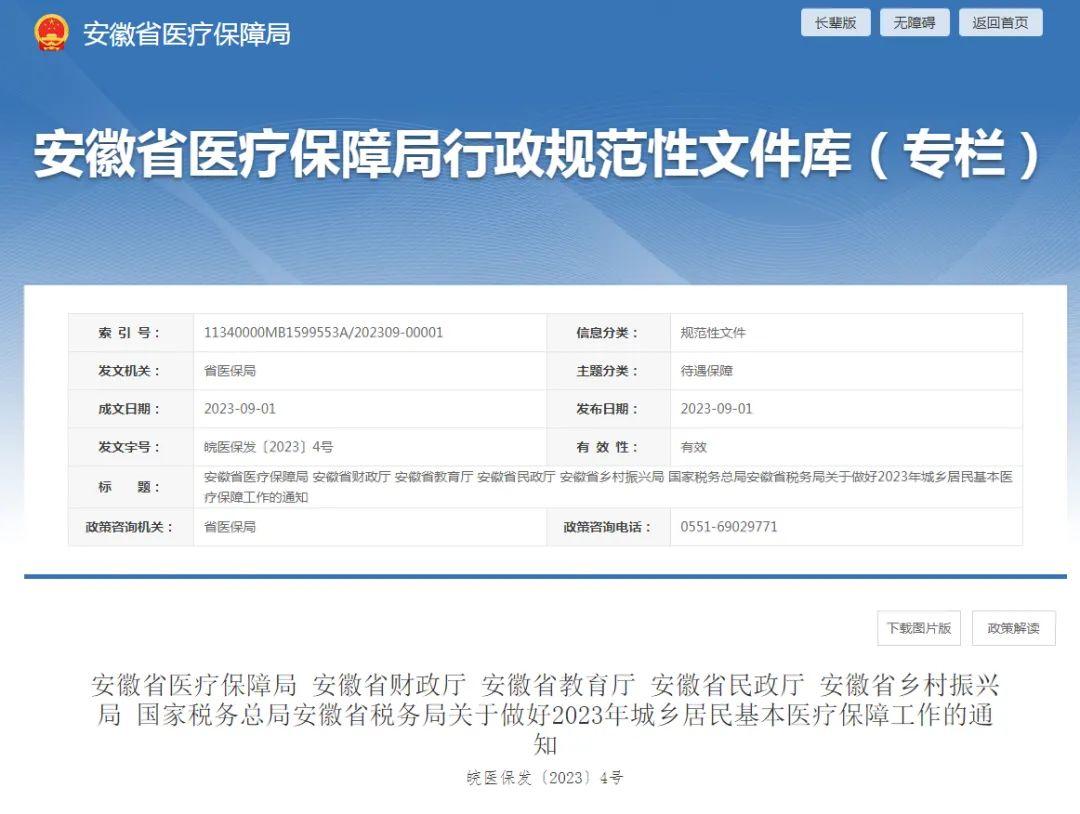 9月1日,安徽省医疗保障局网站发布《安徽省医疗保障局 安徽省财政厅 安徽省教育厅 安徽省民政厅 安徽省乡村振兴局 国家税务总局安徽省税务局关于做好2023年城乡居民基本医疗保障工作的通知》。