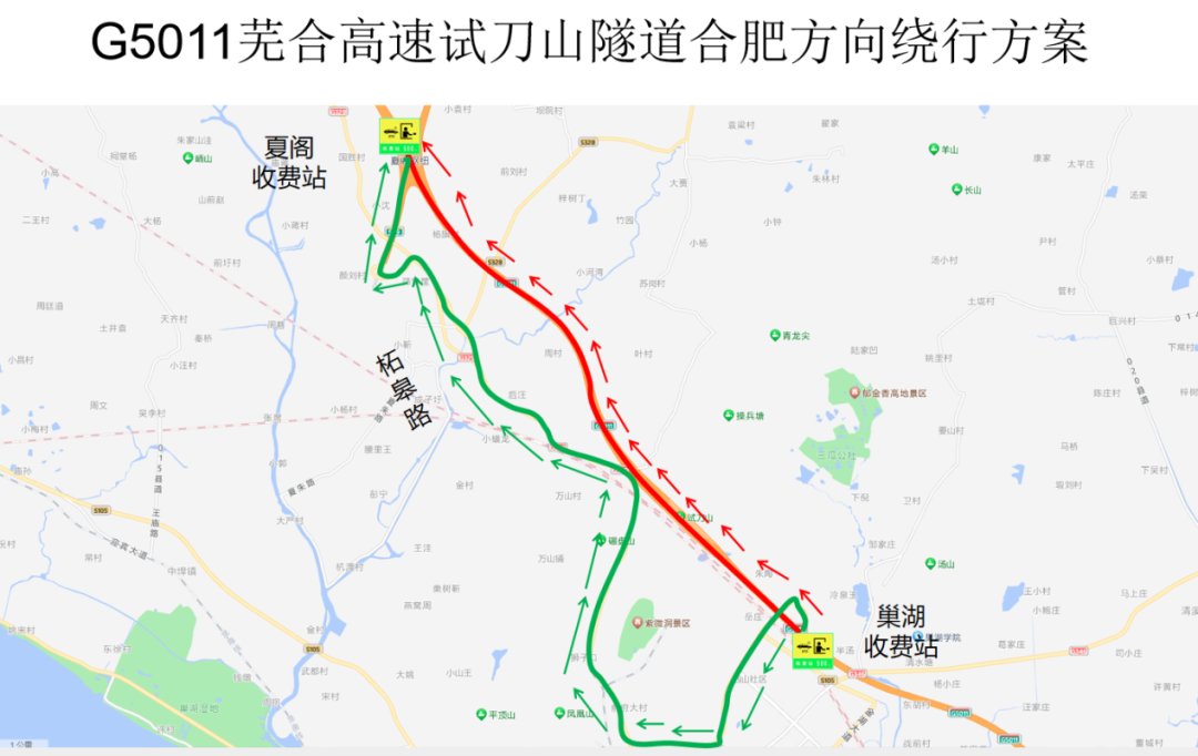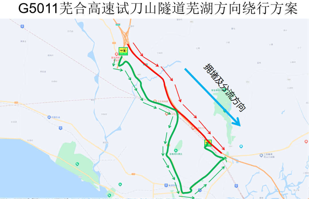 往芜湖方向发生拥堵时,建议在夏阁道口分流,引导车辆行驶至巢湖服务区往前继续前进至夏阁道口下道口,经巢柘路行驶至巢湖北外环,再由巢湖道口上芜合高速,绕开试刀山隧道拥堵路段。