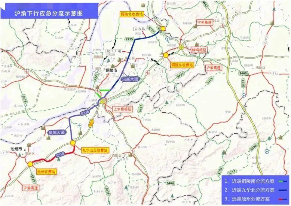 往宣城、芜湖方向发生拥堵时,建议从九华山北收费站、池州收费站下道,经青莲路、长江南路、318国道、321省道、沿新大道、朱永路至铜陵北收费站驶入高速,以有效避开上水桥枢纽至天门服务区拥堵缓行路段。