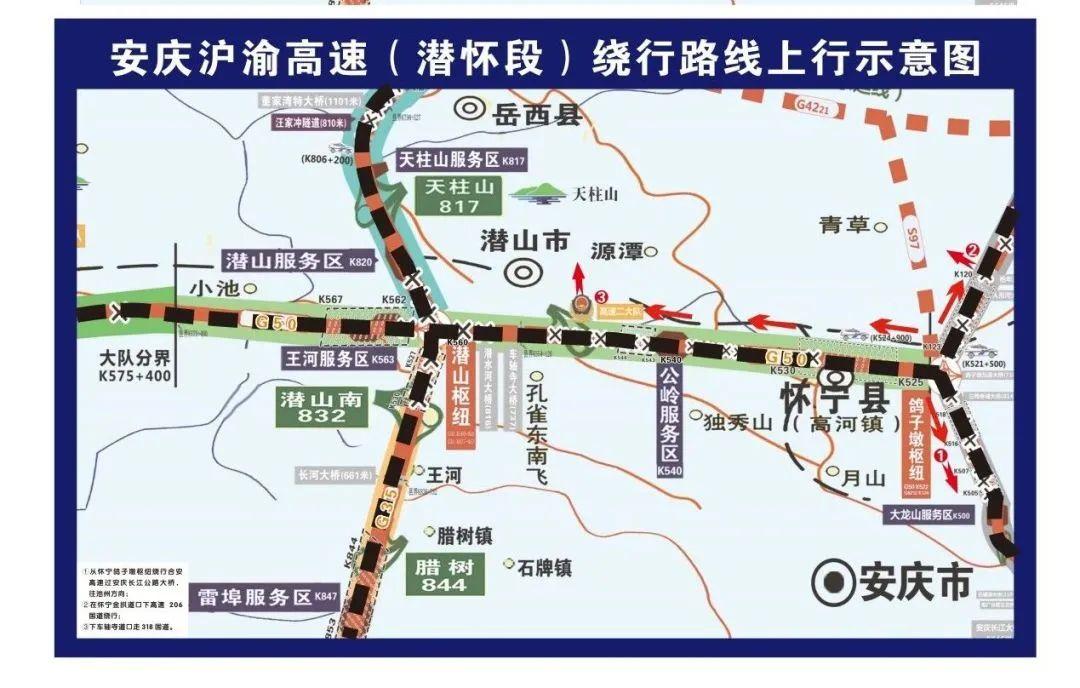 往安庆发生拥堵时,建议从潜山枢纽绕行到G35济广高速至望江、岳西方向;在车轴寺收费站下绕行到318国道,走安庆或潜山方向。