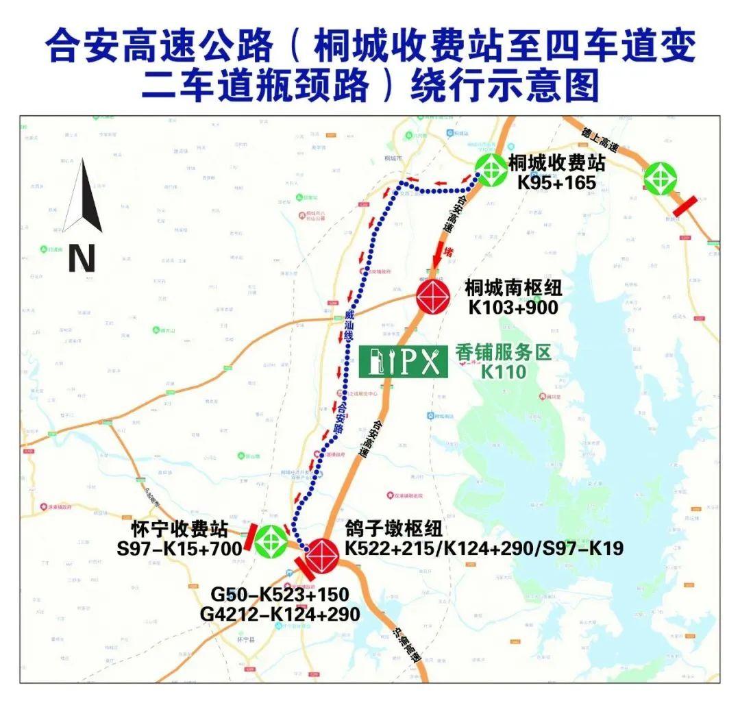 往湖北方向发生拥堵时,建议在鸽子墩枢纽绕行,从怀宁收费站下高速向206国道绕行或从车轴寺收费站向318国道绕行。