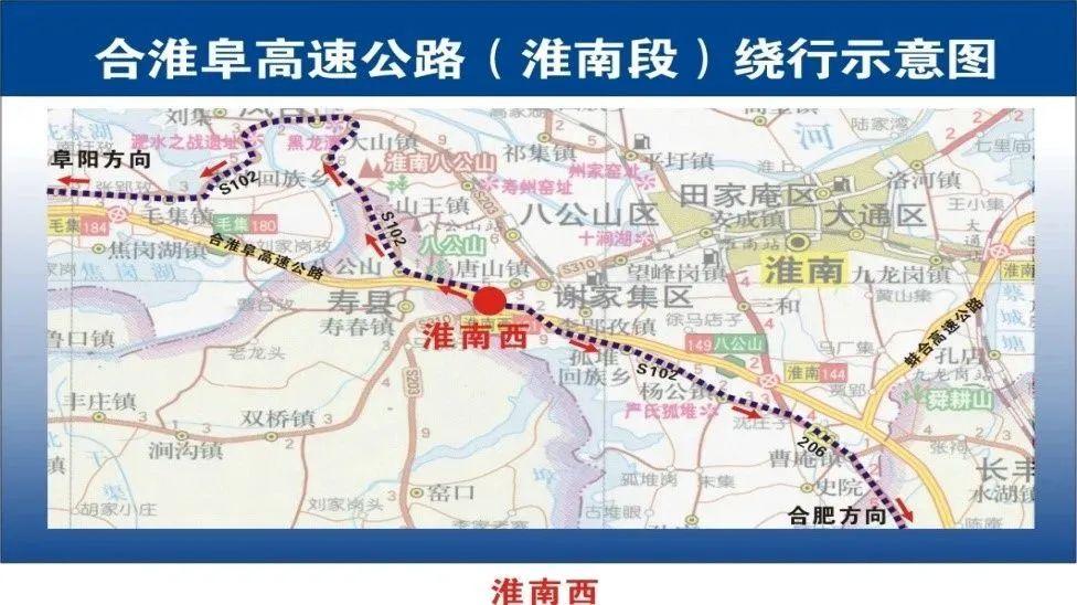 往合肥方向发生拥堵时,建议从淮南西道口驶出,经蔡寿路与102省道右转—沿102省道向东—在孤堆乡并入206国道向南;往蚌埠方向的车辆经蔡寿路,沿206国道穿市区经国庆路向西;往阜阳方向发生拥堵时,建议经蔡寿路左转至102省道—沿102省道经凤台后向北。