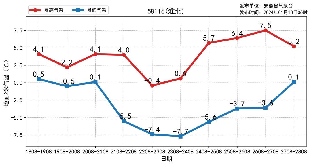 18日至22日我省气温持续下降。受冷空气持续影响,18日至22日全省平均气温下降6~9℃,局部超过12℃。此外,21日至22日全省偏北风3~4级,阵风7级左右。冷空气过后,23日至24日早晨最低气温:沿淮淮北和本省山区-9~-6℃,其他地区-7~-5℃。24日后全省气温逐渐回升。