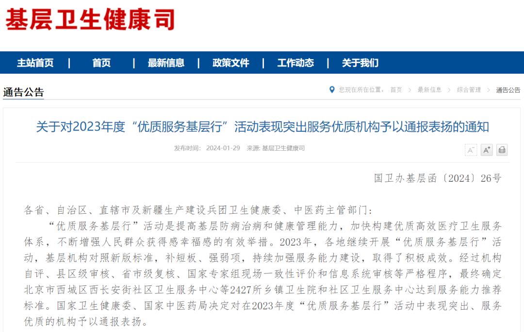近日,国家卫生健康委发布关于对2023年度“优质服务基层行”活动表现突出服务优质机构予以通报表扬的通知。