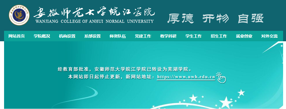 3月14日,记者在登录原安徽师范大学皖江学院官网时发现,该网站已经停止更新,网站首页顶部刊登了醒目的公告,告知访客:“芜湖学院”校名正式启用。