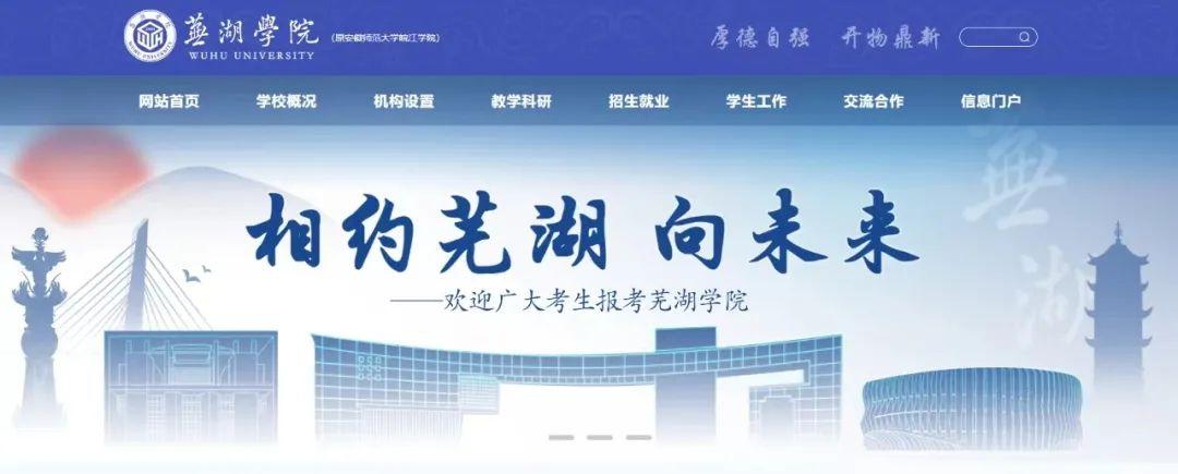 “相约芜湖,向未来!欢迎广大考生报考芜湖学院。”点击进入新网站,只见网站显著位置有一则欢迎语,以蓝色为基调的新首页跃然眼前,整体风格简洁大方。全新的校名,全新的学校LOGO,让人耳目一新。