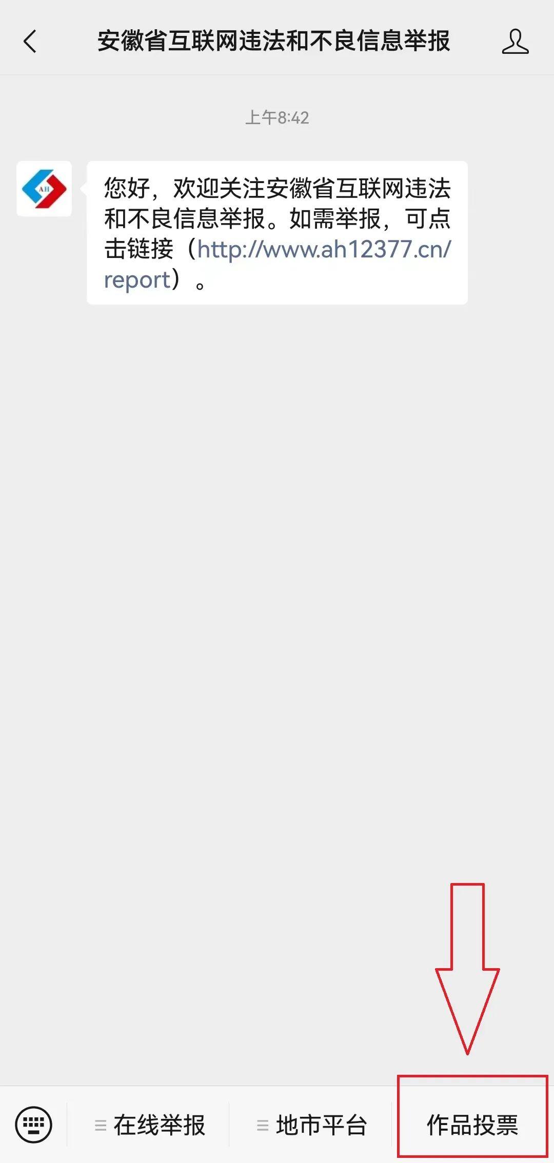 搜索关注“安徽省互联网违法和不良信息举报”微信公众号,点击右下角菜单栏“作品投票”,参与投票!