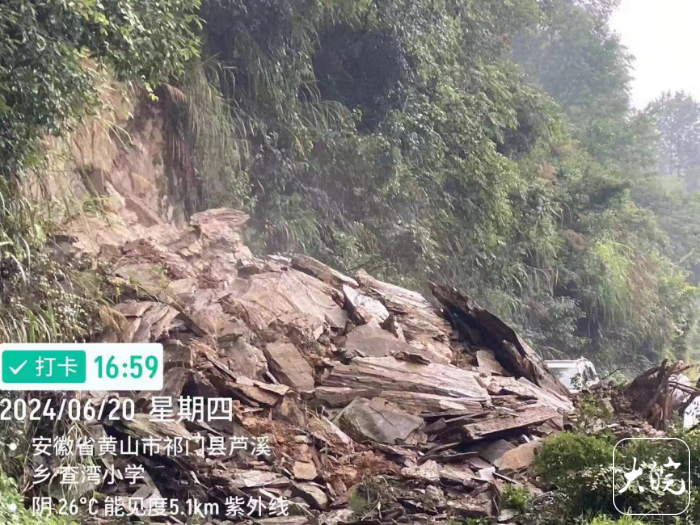 6月20日12时,黄山市祁门县芦溪乡查湾村灾害风险隐患信息报送员李加强、胡亚霖在巡查时发现,该村前往尚田村民组路边山体有碎石滑落现象且整个山体底部有空洞。因降雨还在继续,随时会有大面积滑坡现象。两名灾害风险隐患信息报送员立即将该处隐患向芦溪乡政府报告,同时拉设警戒线,安排人员在道路两边执勤值守,提醒过往人员注意安全。16时左右,该路段碎石开始持续滑落,执勤人员立即制止过往行人和车辆通行。16时50分出现大面积滑坡,直接覆盖道路阻断交通。由于降雨仍在继续,随时可能发生滑坡,清理存在安全隐患,芦溪乡政府安排专人对此地进行24小时值班值守。21日上午7时芦溪乡政府安排人员加紧对该处滑坡进行清理,11时30分清理完毕恢复道路畅通。由于隐患发现早,乡政府应对及时,未出现人员伤亡和财产损失。