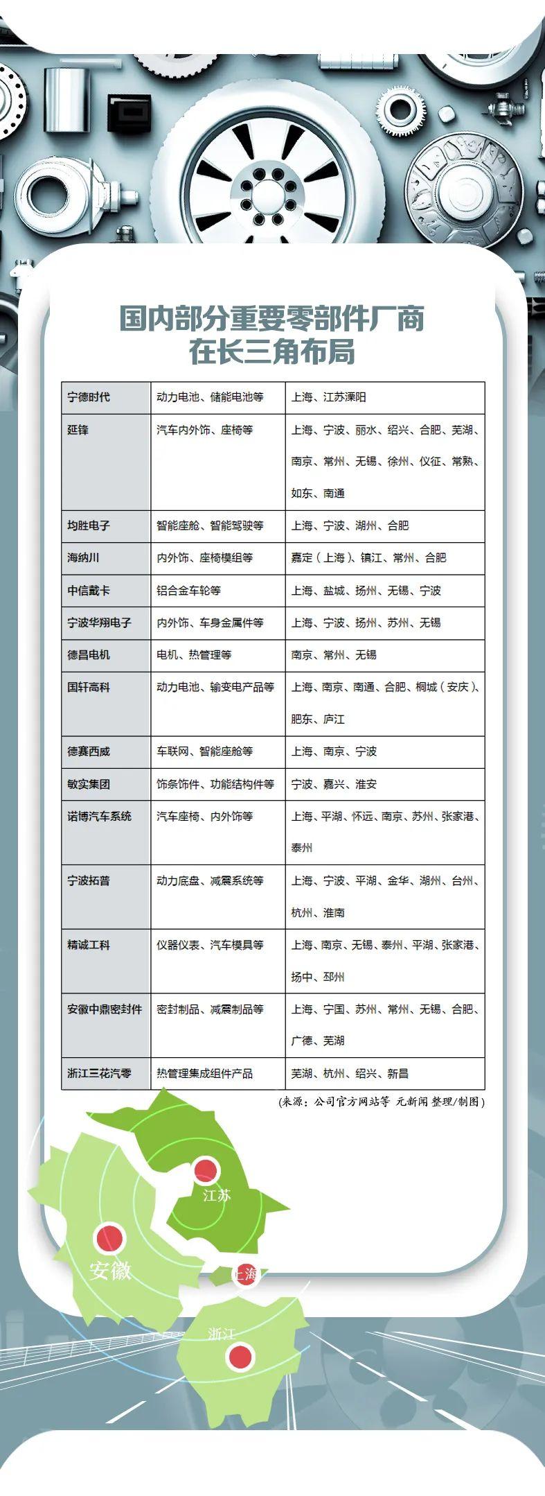 元新闻统计了上述15家中国零部件供应商在长三角生产基地和研发中心的布局,绝大多数都已落子三省一市。