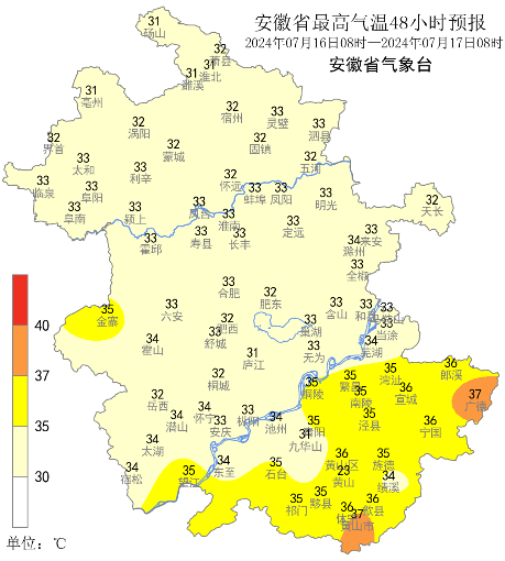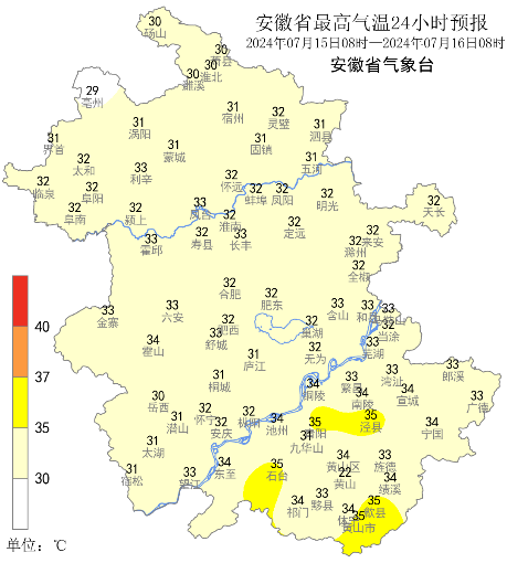 16日开始淮河以南有晴热高温天气。16日江南、17-21日淮河以南、22-24日全省将普遍出现35℃以上晴热高温天气。