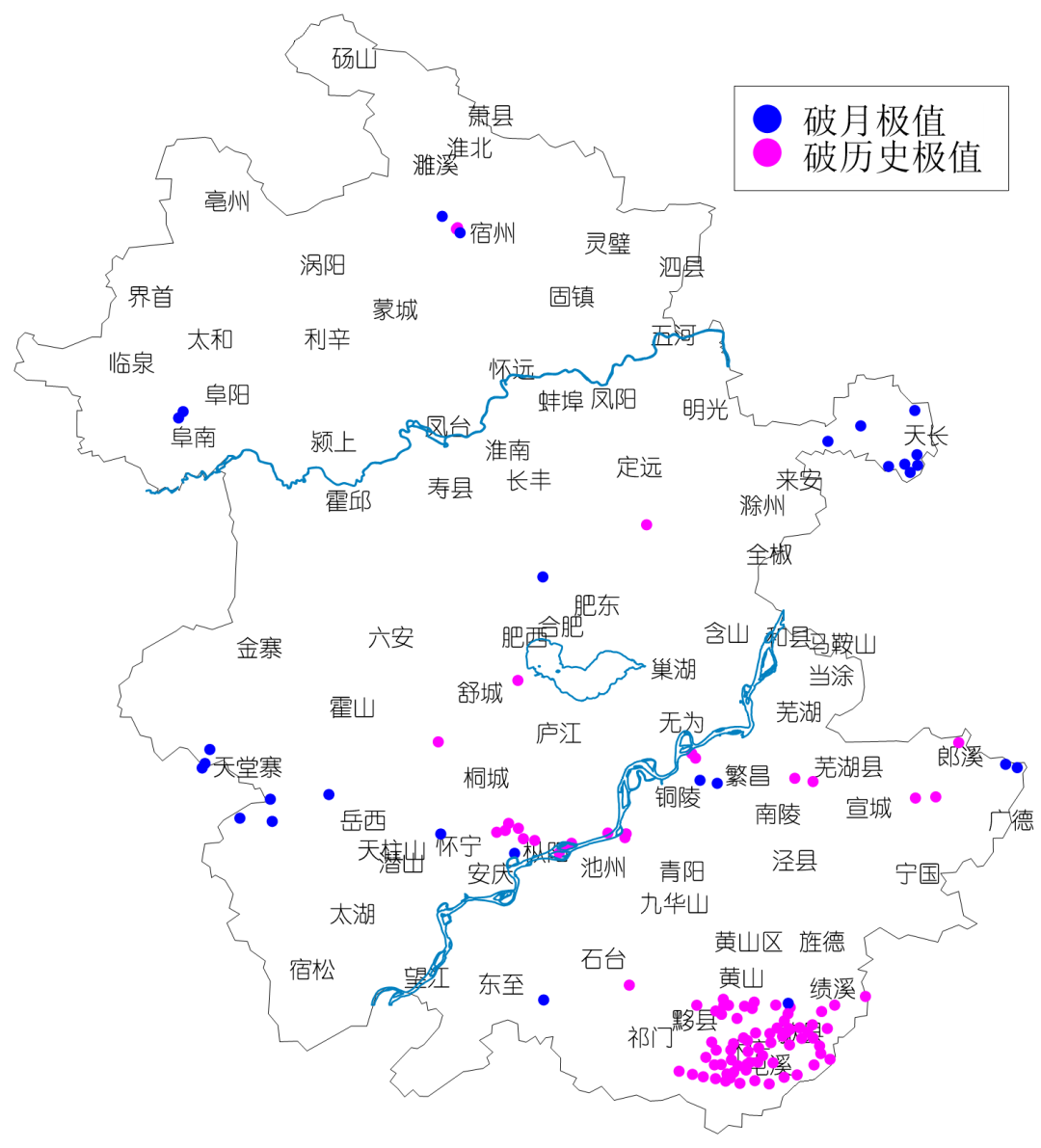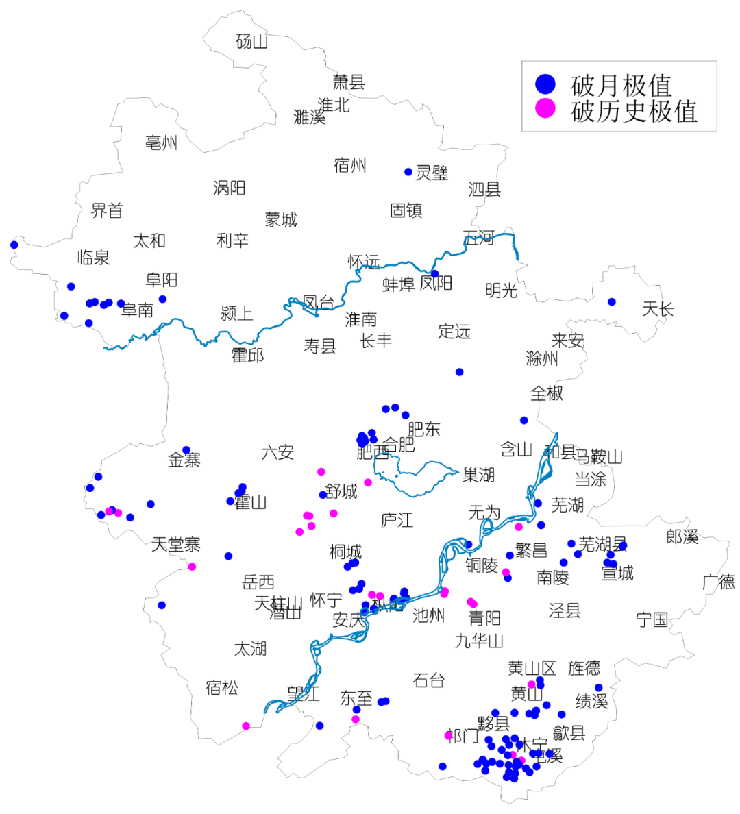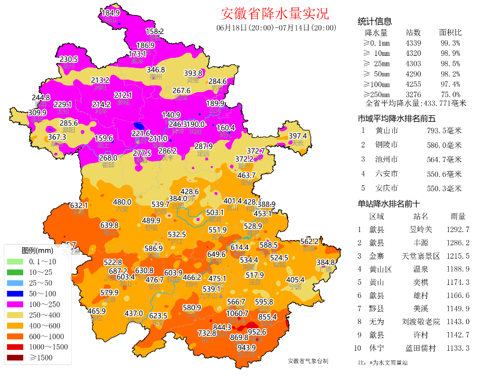 淮河以南平均暴雨日数4.1天,为1961年以来同期最多,其中屯溪和黄山光明顶达8天。特大暴雨67站次,其中6月20日52个(51个在黄山市),7月13日11个(8个在铜陵市),最大黄山市奕棋站(405.7毫米)。屯溪(308.3毫米)、休宁(258.4毫米)和歙县(239.1毫米)3个国家站突破本站历史极值,屯溪为首次出现特大暴雨。