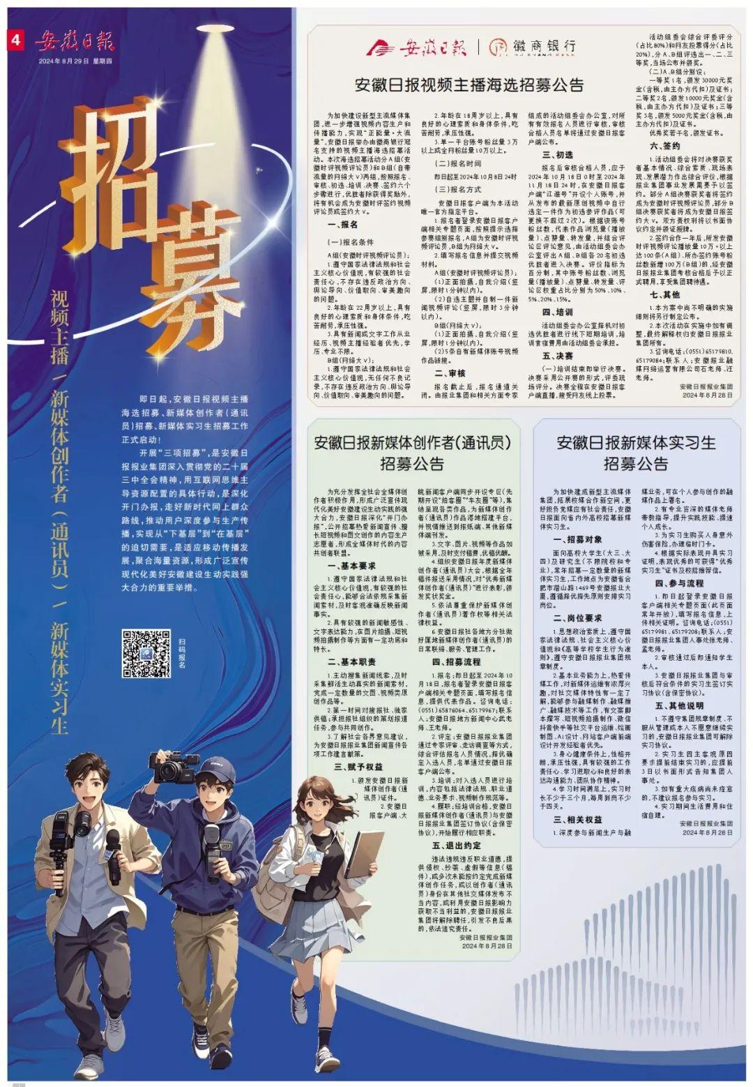 即日起,安徽日报视频主播海选招募、新媒体创作者(通讯员)招募、新媒体实习生招募工作正式启动!