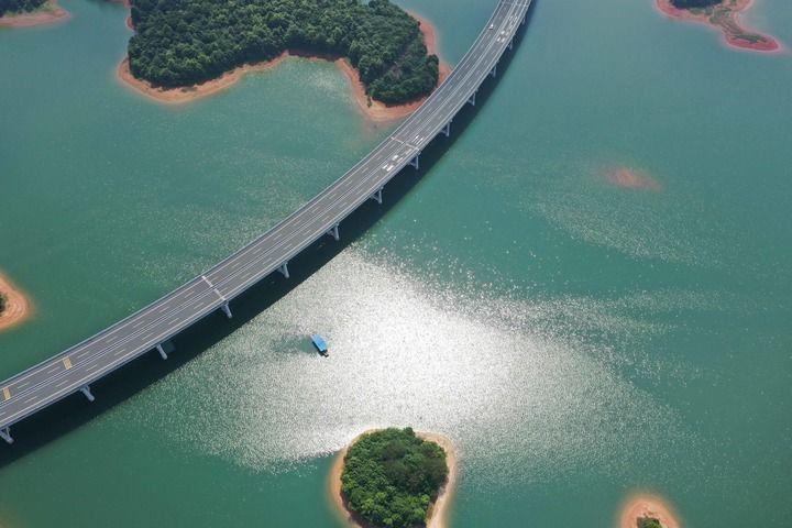 这是位于江西省九江市永修县与武宁县交界处的庐山西海与跨过水面的永武高速公路(无人机照片,2024年6月7日摄)。 新华社记者 周密 摄