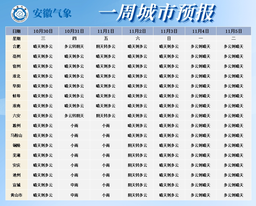 11月1日(周五):淮北地区晴天到多云;淮河以南阴天转多云大部分地区有小雨,其中江南东部地区中到大雨。
