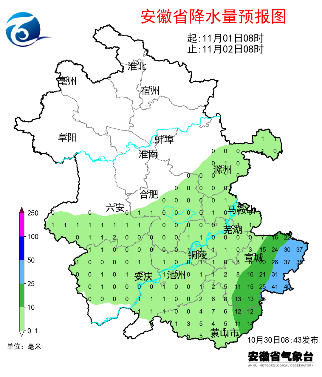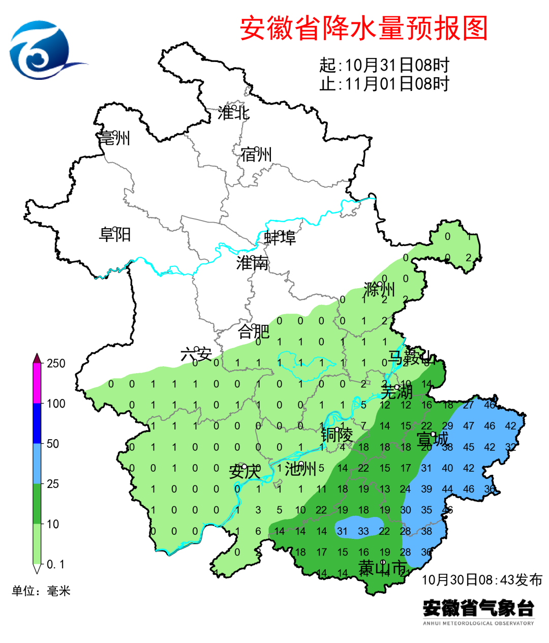 明后两天沿江江南有较明显降水,并伴有5~6级阵风。10月31日-11月1日淮河以南大部分地区有一次降水过程,其中沿江江南中雨,宣城和黄山等部分地区大雨,过程最大累计雨量60~80毫米,主要降水时段为10月31日下午至11月1日白天,最大雨强20~40毫米/小时。台风影响期间,淮河以南阵风5~6级,其中山区和水面阵风7~8级。2日后全省以晴到多云天气为主。