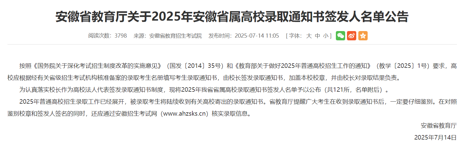 7月14日,安徽省教育厅发布公告,公布2025年安徽省属高校录取通知书签发人名单(共121所)。