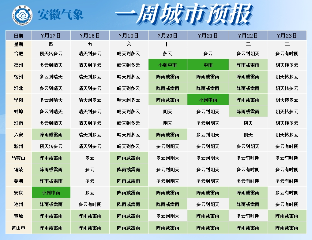 17日(周四):大别山区和沿江江南阴天转多云,有阵雨或雷雨,部分地区中到大雨;其他地区多云到晴天。