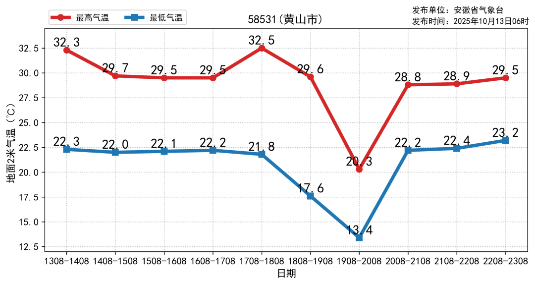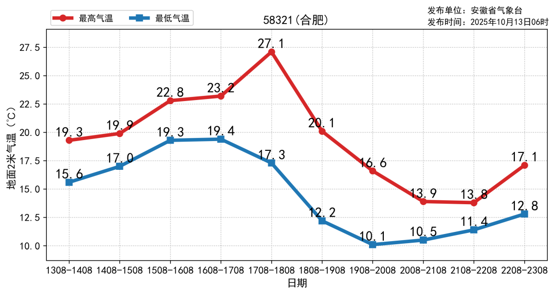 图2 未来十天淮北、合肥、黄山市逐日气温预报