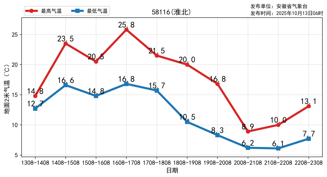 气温和大风预报:13-14日受冷空气影响,江南平均气温继续下降,14日早晨最低气温:淮河以北:12~14℃;江淮之间北部:14~16℃;江淮之间南部:16~18℃;江南:18~20℃。16-20日有冷空气持续影响我省,全省平均气温将下降7~9℃,局部超过10℃,其中17-19日全省偏北风力增至4级左右,阵风7~8级,冷空气过后21日早晨淮北地区最低气温降至10℃以下。