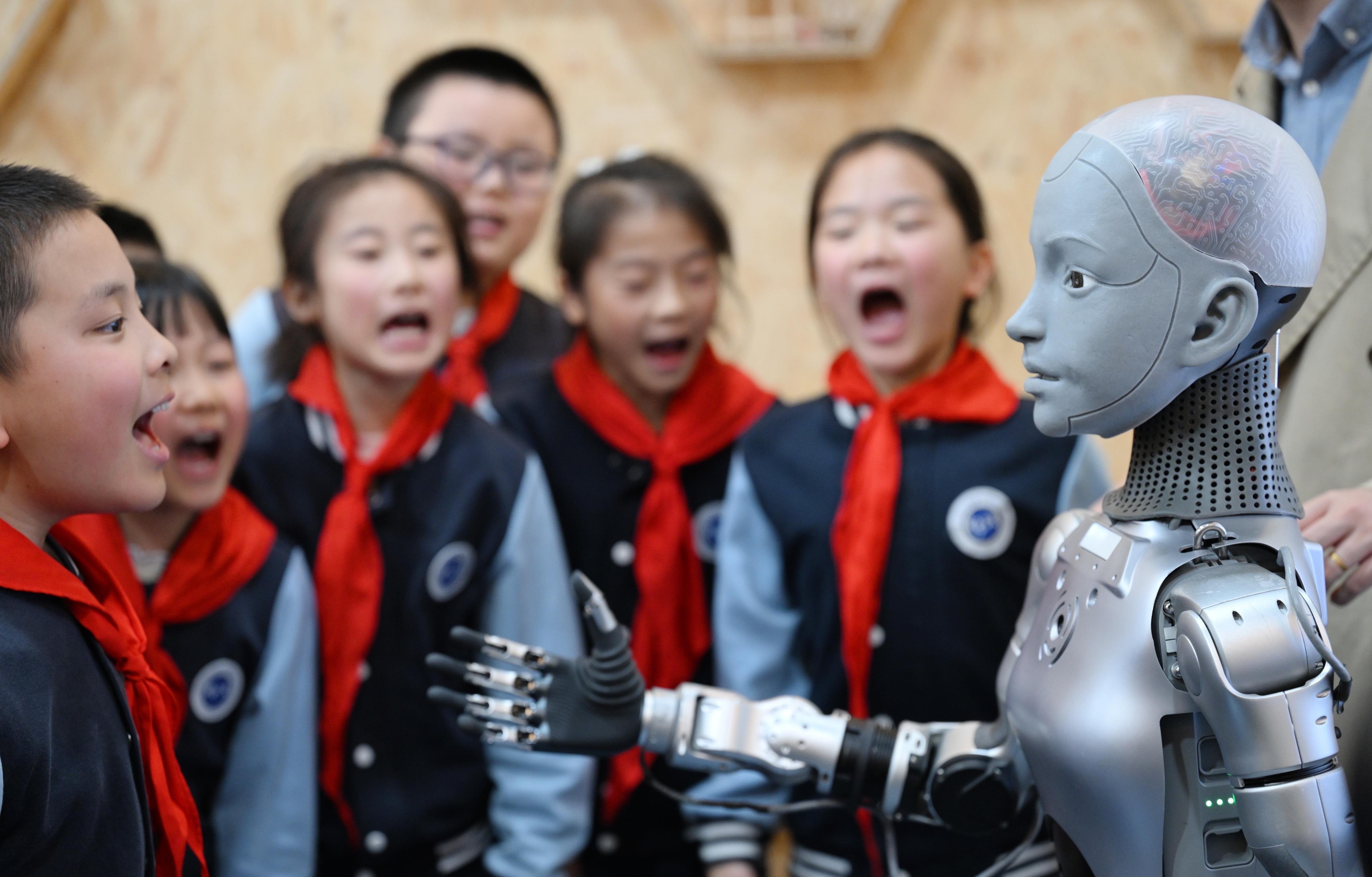 日前,无论科技(安徽)有限公司自主研发的教育仿生机器人“小安”来到合肥市师范附小,与该校学生互动。本报记者 张大岗 摄