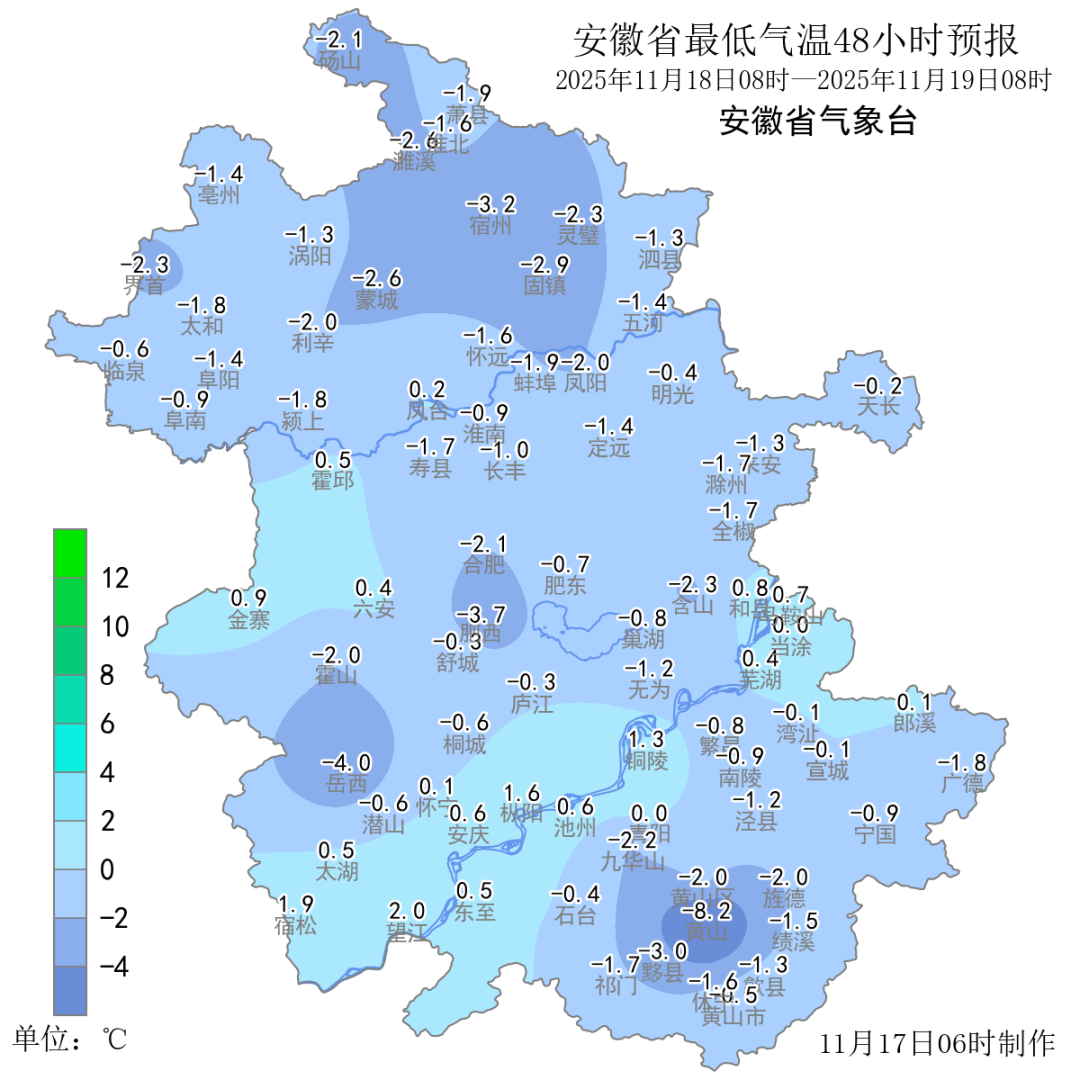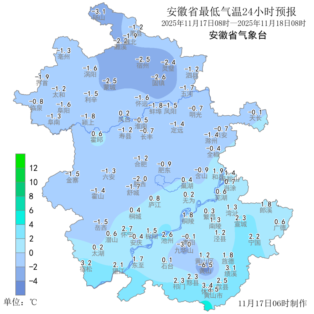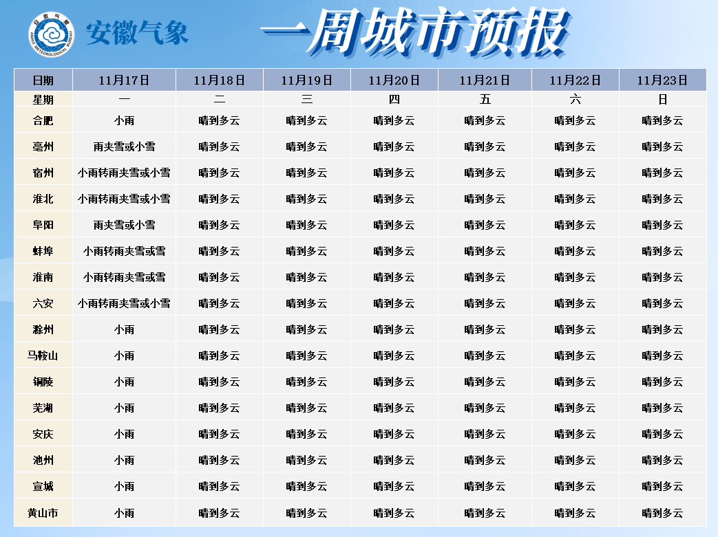 17日(周一):全省阴天转多云。淮河以北西南部有雨夹雪或雪;淮河以南有小雨,其中大别山区有雨夹雪或雪、局部冻雨,皖南山区有小雨转雨夹雪或雪。