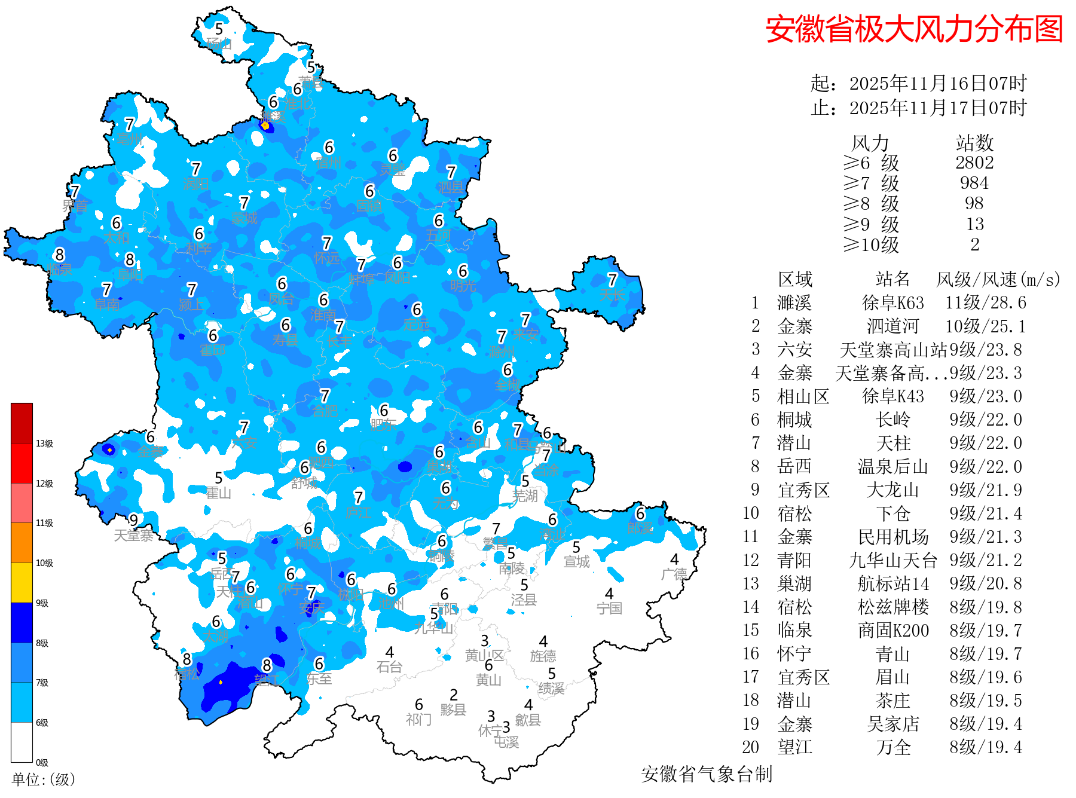 据安徽气象微信公众号消息,昨天白天全省以多云天气为主,夜里淮河以北部分地区和江淮之间西部出现小雨;阜阳、亳州、淮北、宿州、蚌埠等地有7个站出现雨夹雪或雪,地面无积雪。沿江江北有98个站出现8级以上阵风,13个站超过9级,2个站超过10级,最大濉溪徐阜高速站28.6米/秒(11级)。